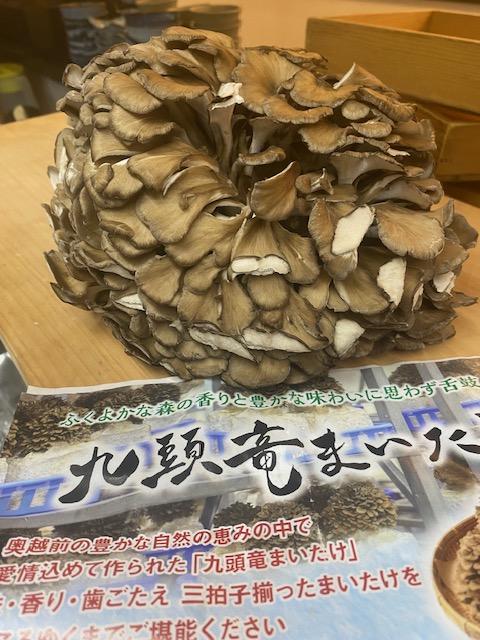 先ずはこの舞茸。九頭龍舞茸の名の通り九頭龍湖の側で栽培されているのです。菌床栽培でこの立派な舞茸が育ってます。香り良し、旨み強しです。天ぷらでいかがですか。